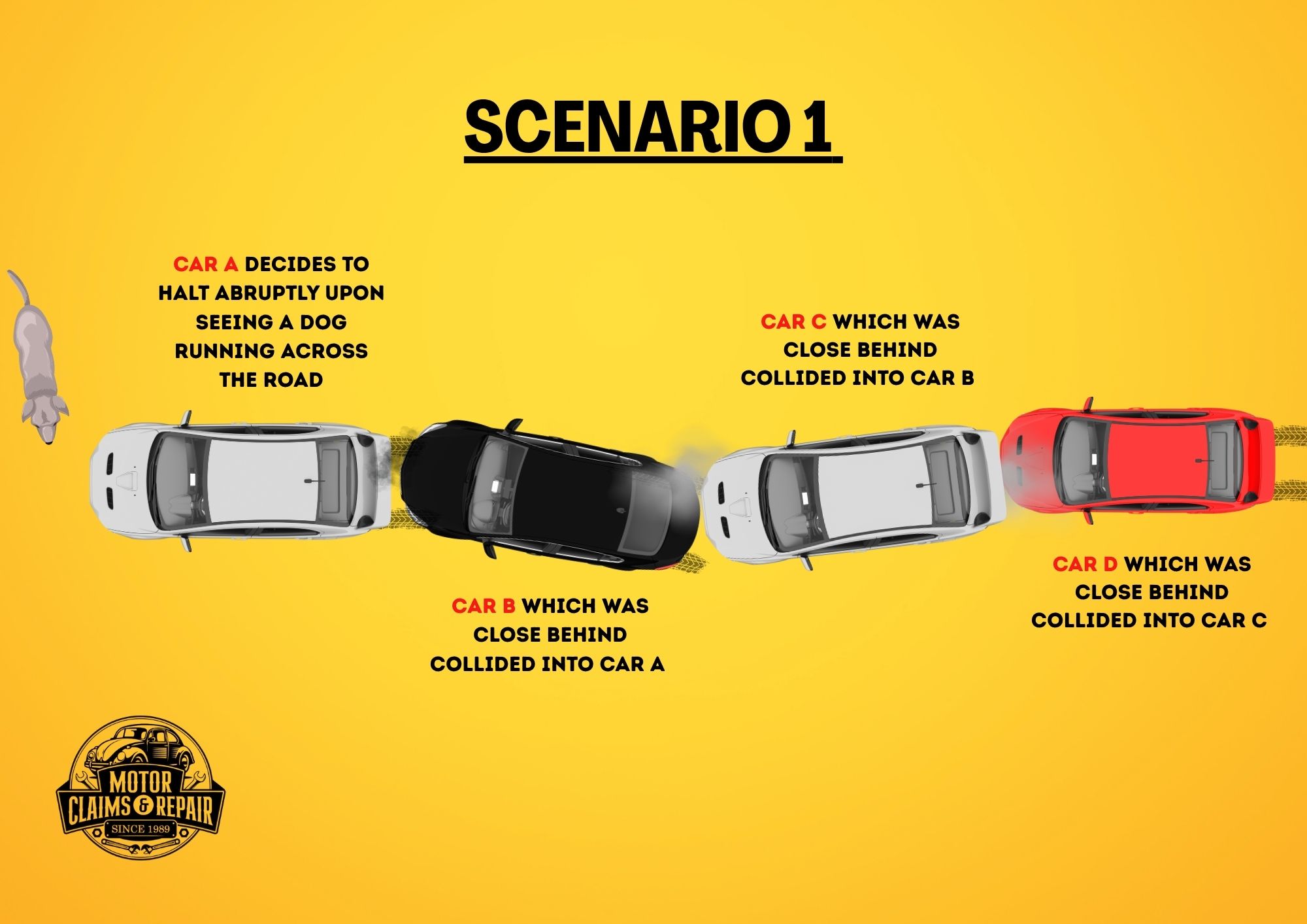 In this case, Car B, C, and D all failed to keep a safe braking distance and were unable to stop in time. They are all liable for the cars they rear-ended each. Only Car A is not at fault