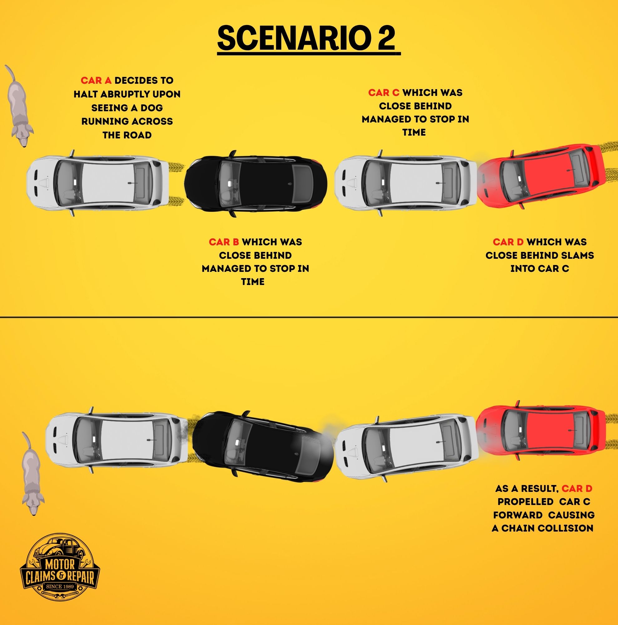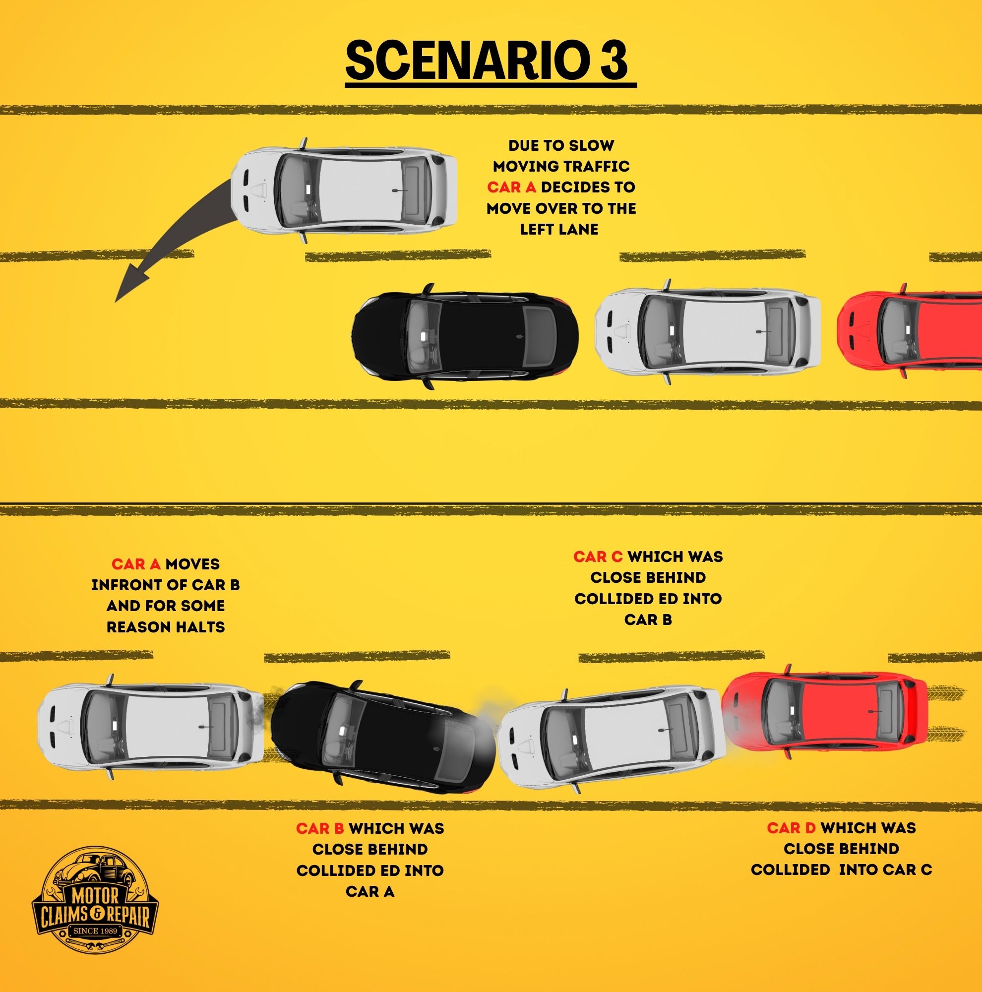 While this case closely resembles Scenario A, it has additional complications. In the majority of cases, the cars at the back are liable for the accident due to a failure in keeping a safe braking distance. Without camera evidence of Driver A’s reckless driving behaviour, he could be able to avoid liability even though he is at fault. That is why installing a front and rear car camera is so important and recommended.